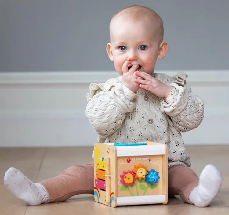 Tenk på at barnet bare ser de store kontrastene i starten. Derfor er klare avgrensede mønstre og former bedre enn små, søte detaljer. Babyen utforsker ofte ting med munnen. Vær derfor nøye med hva du kjøper og sjekk lekene med jevne mellomrom.