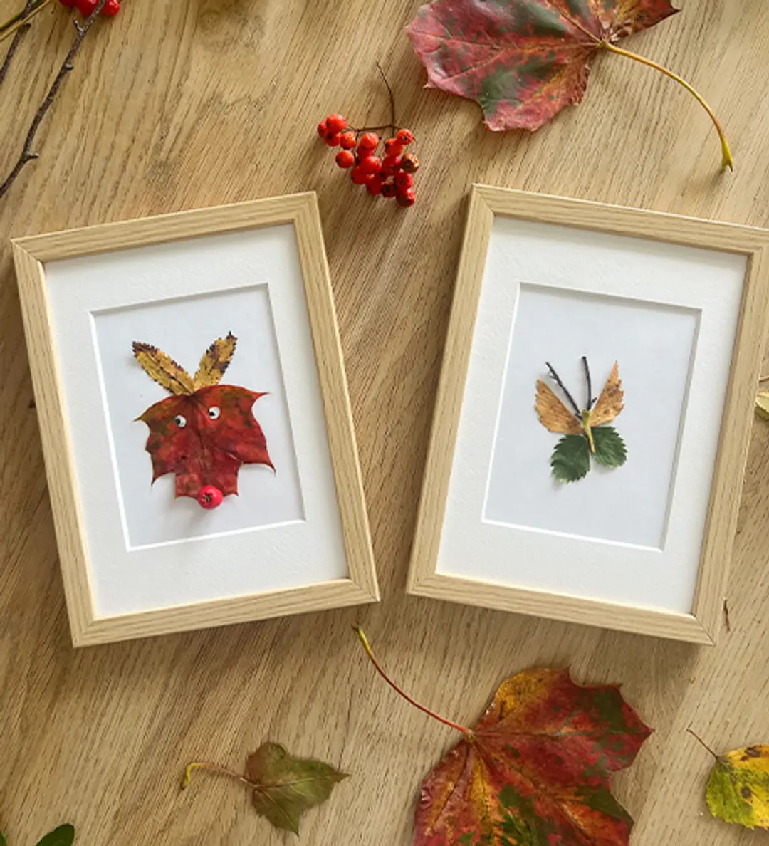 🍁 Høstbilder: Press høstblader i blomsterpresse, lim på papir og dekorer med ønsket glitter, rognebær, tusj eller maling. Ram de gjerne inn- superfin gave