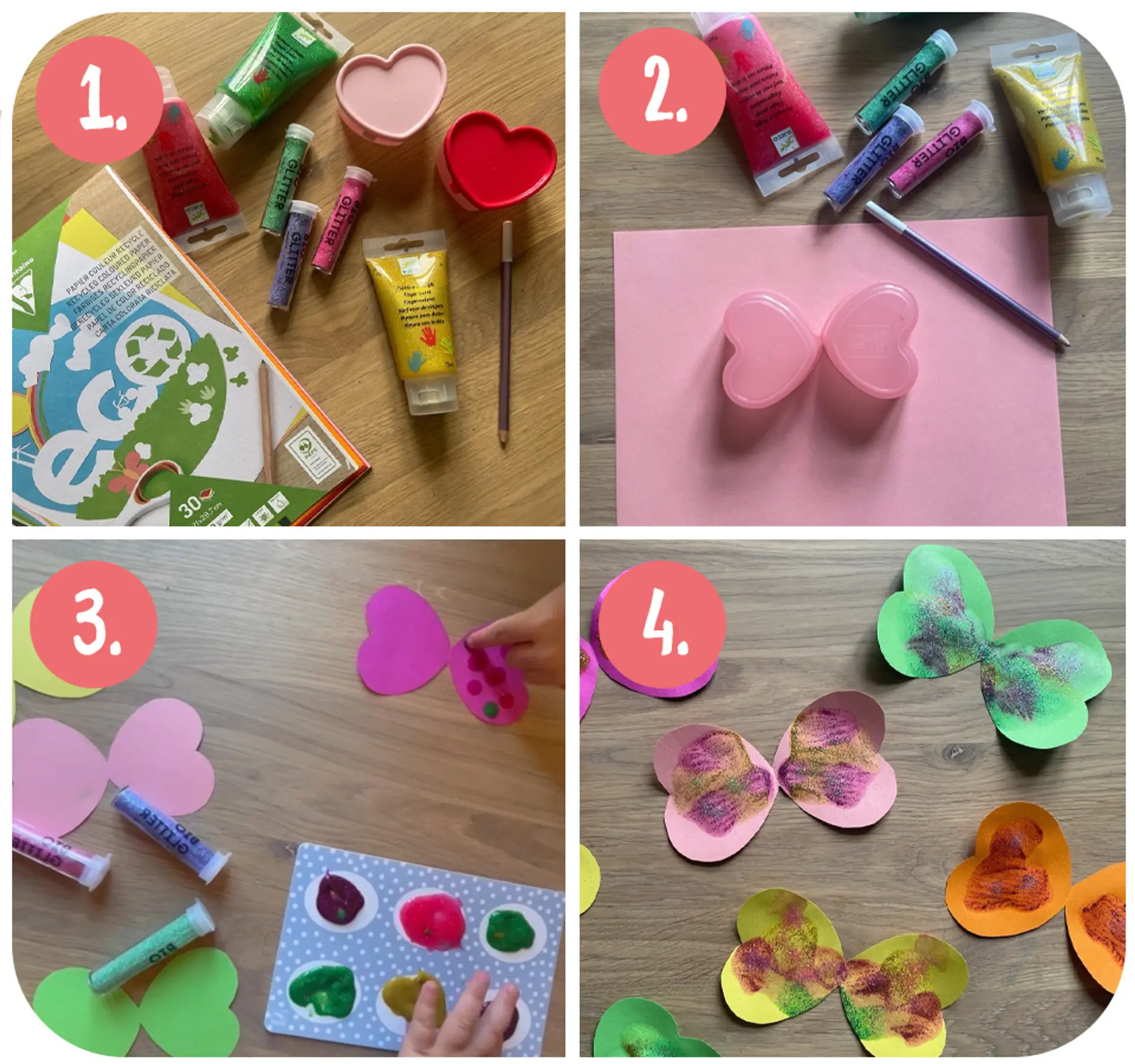 - Tegn sommerfugler på de fargede arkene. Bruk gjerne en mal – vi la to små hjerteformede plastbokser tett inntil hverandre for å få sommerfuglform.