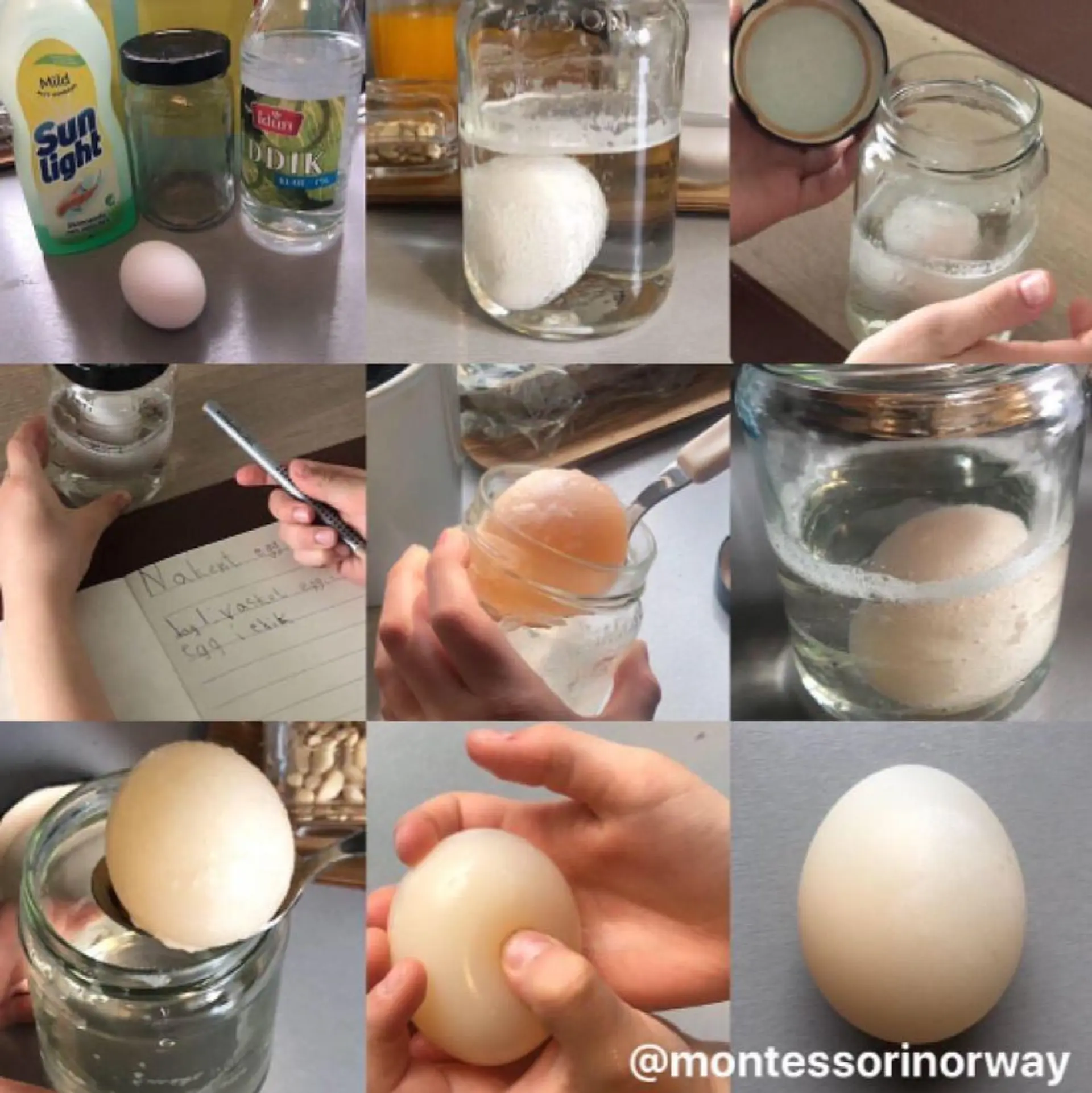 1. Vask et ukokt egg med litt oppvaskmiddel, legg det i et glass og fyll opp med eddik. Det skjer en kjemisk reaksjon og du vil se at det bobler seg rundt skallet. Eddiken bryter nemlig ned skallet.