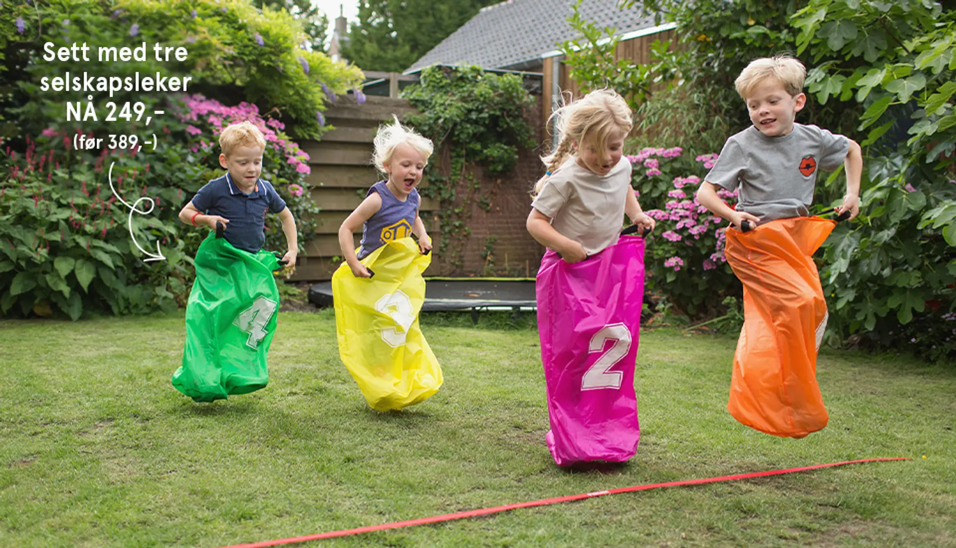 Hopp, le og konkurrer i denne tidløse favoritten! Hver deltaker trår oppi sekken, holder godt fast – og hopper i vei mot mål. Førstemann vinner! Kjøp sett med tre selskapsleker og få med sekkeløp, eggeløp og kast på boks – alt du trenger for morsom 17. mai-lek for hele familien.
