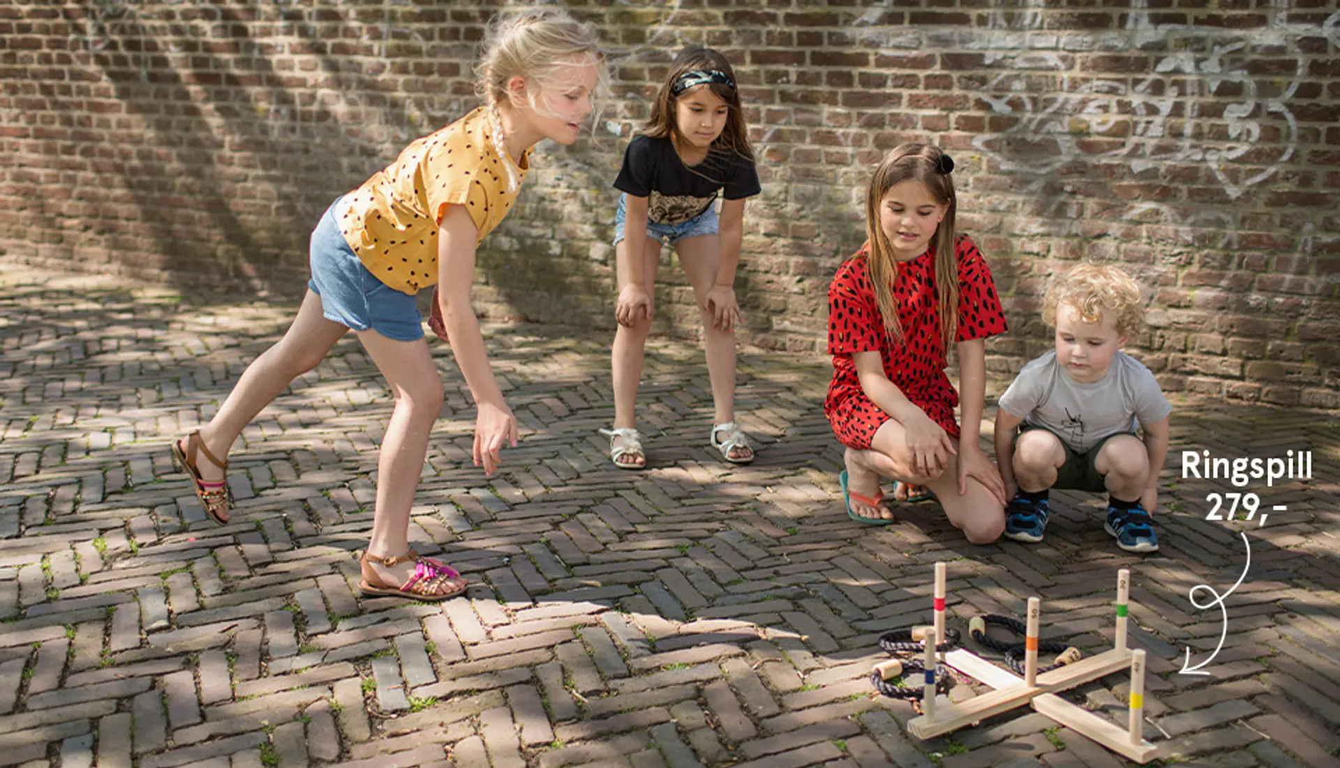 Ringspill er perfekt for 17. mai-feiringen, og passer både store og små! Spill alene eller mot hverandre – det gjelder å få ringene til å lande rundt pinnene. Spillet består av fem pinner med ulik poengsum og fire ringer med lodd for stabil kasting, spesielt for de minste. Hver spiller kaster én ring om gangen. Hvem blir familiens ringspillmester og får flest poeng?