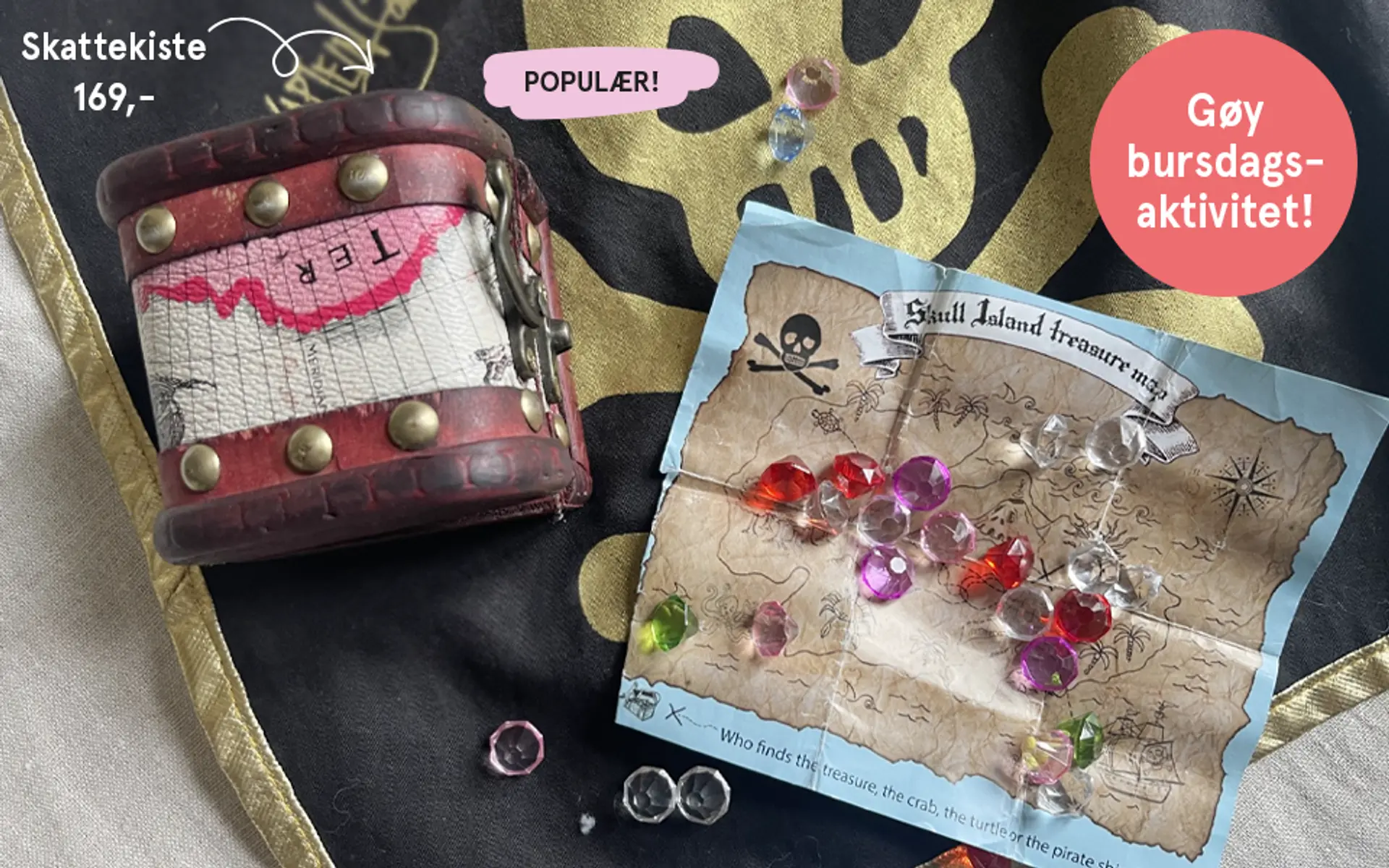 🎁 Hva venter i skattekisten? Kanskje noe godt å spise, små leker, en sjørøvertatovering eller en overraskelse fra en ekte sjørøver! Ta fantasihattene på og bruk både hodet og øynene. Nå starter jakten!