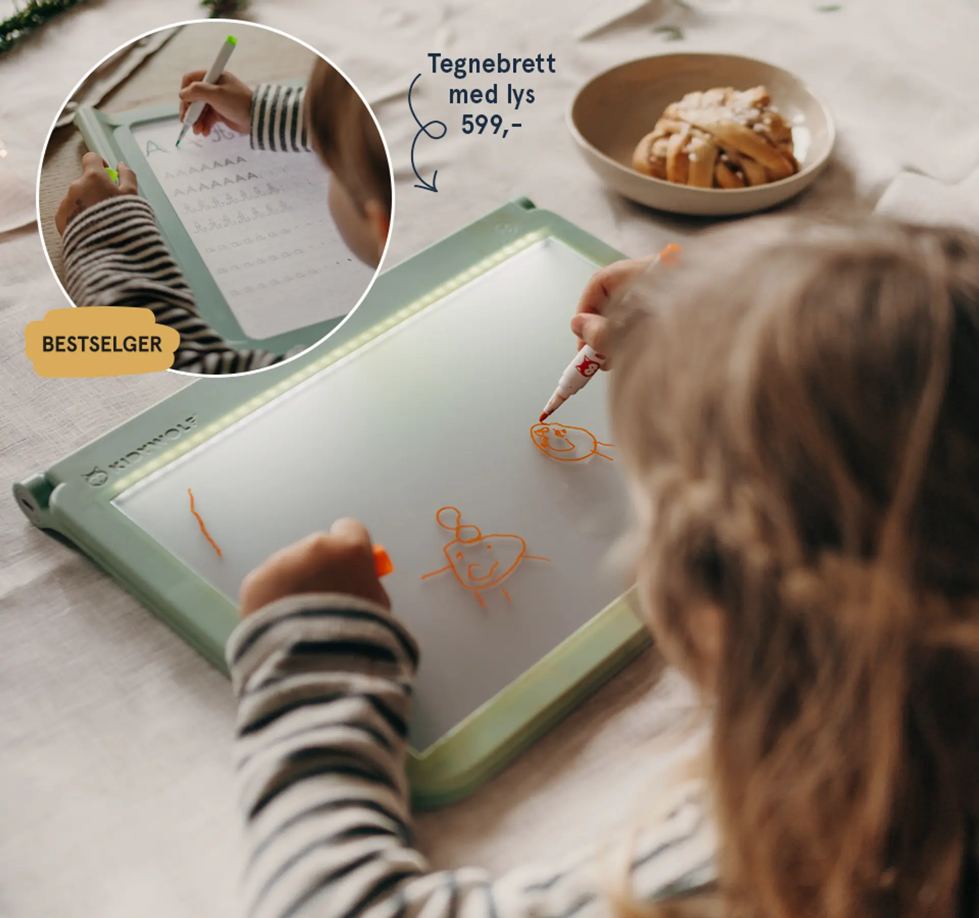 Kidywolf sitt 2-i-1 tegnebrett gjør det gøy å lære, perfekt for å styrke finmotorikk, kreativitet og skriveferdigheter! Med to tegneflater – en lysende kopiside og en neontavle – får barna både øve på bokstaver og tall, og slippe fantasien løs med tegninger som lyser i mørket.