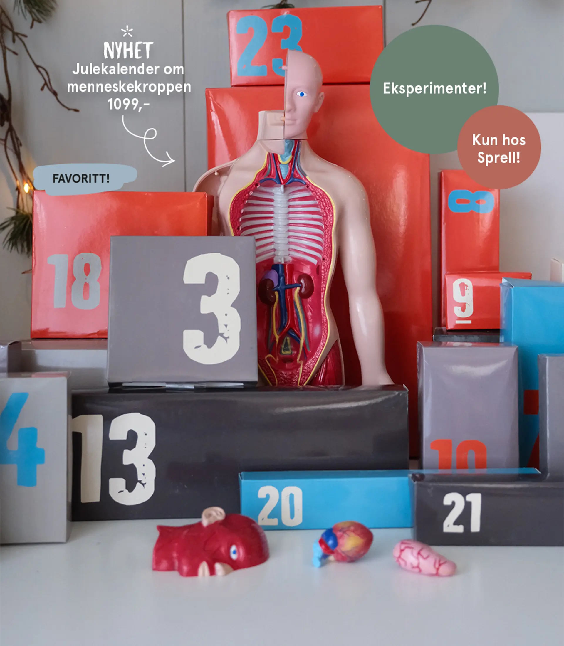I denne kalenderen lærer du kule og nyttige fakta om kroppen vår og tester morsomme eksperimenter- blant annet å lage en promp!