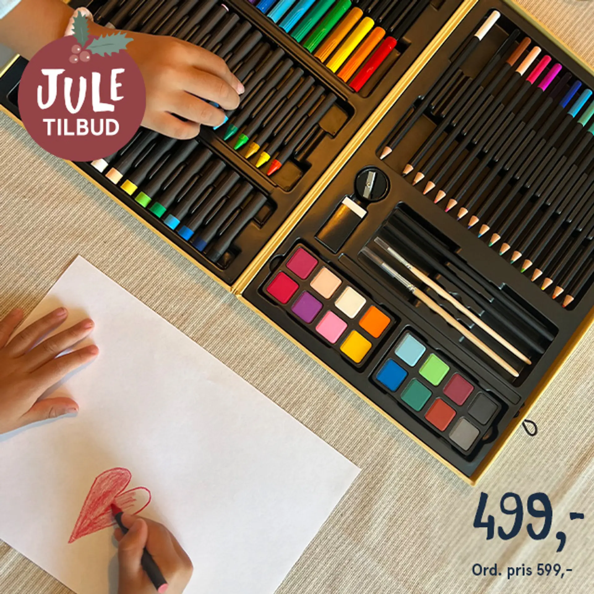 Inneholder tusjer, fargeblyanter, fettblyanter, fettstifter, maleskrin med vannmaling, blyantspisser, viskelær og pensler.