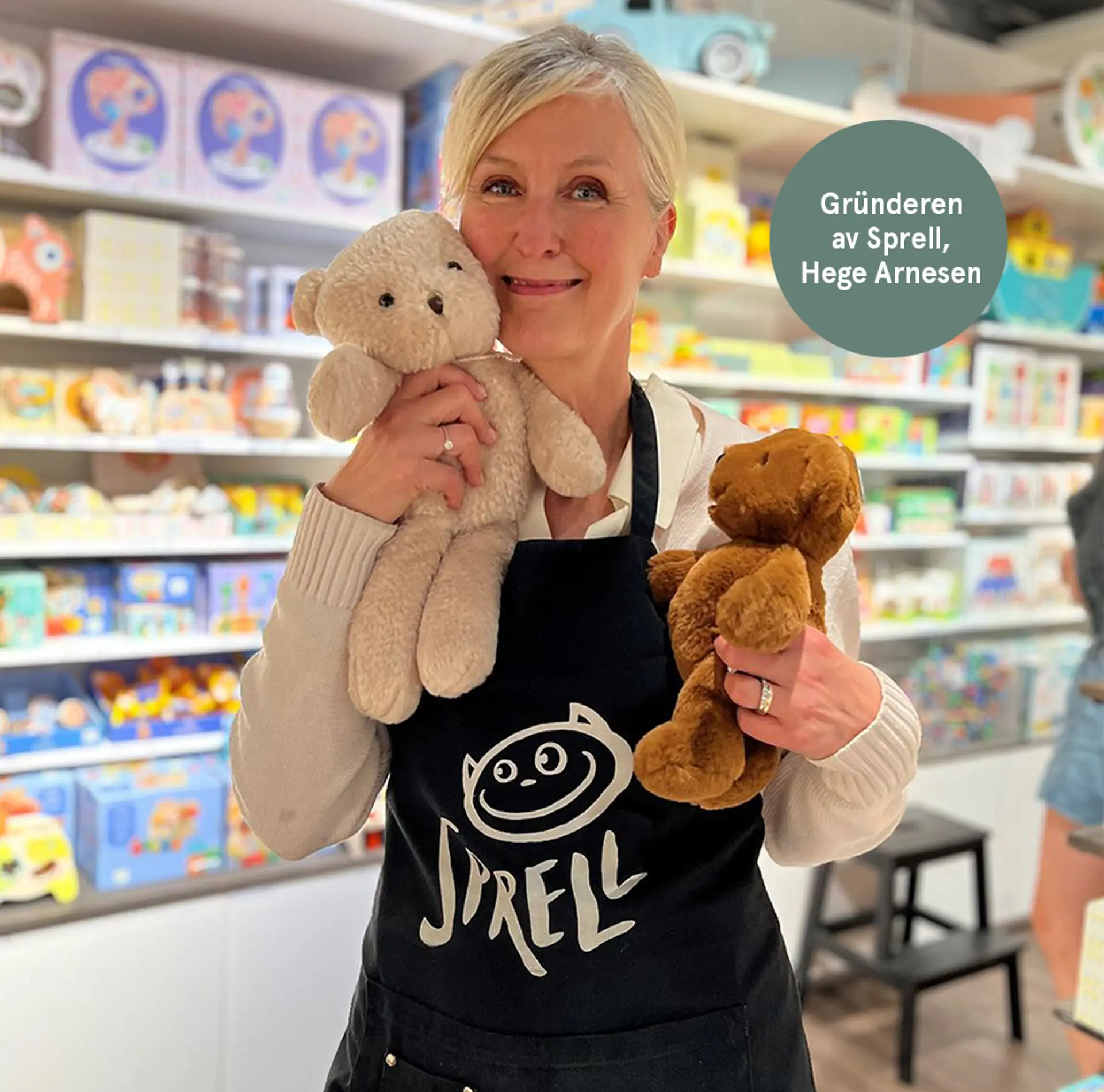 Historien om Sprell begynte hjemme, med fargestifter på bordet, treleker på gulvet og et lite menneske i armene. Da vår gründer Hege Arnesen ble forelder på 90-tallet, oppdaget hun et savn. Hun lette etter leker med sjel: laget av gode materialer, med høy pedagogisk verdi, og som tok barns lek på alvor. Slike leker var vanskelige å finne. Så hun bestemte seg for å skape en destinasjon hvor nettopp foreldre kunne finne denne type leker.